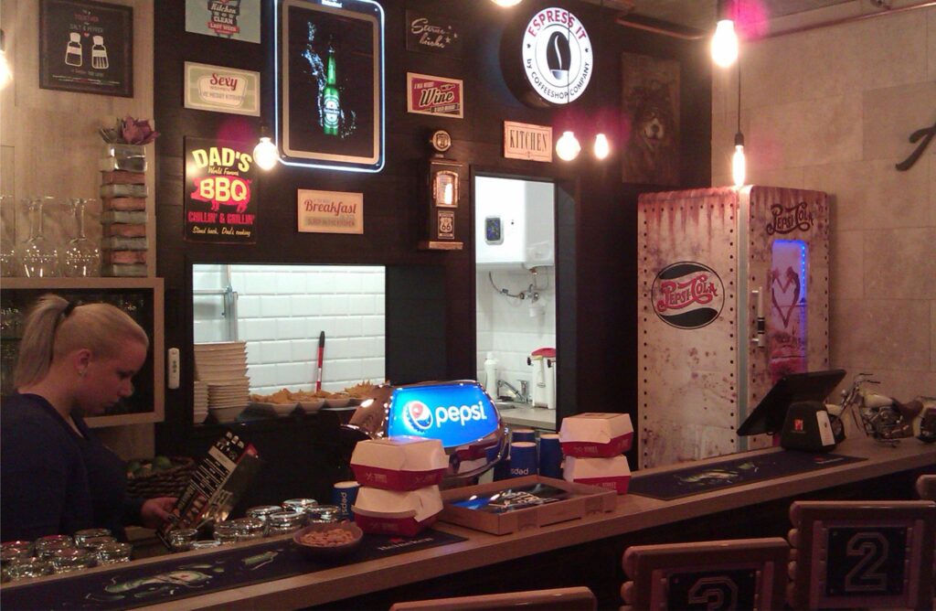 Egy igazi jó hamburger, sültkrumplival és kólával. A mészkő és fekete tölgyfaburkolat készséggel adják át a terepet a világítótábláknak, kiegészítőknek. A retro hűtőből az icetea is jobban pezseg amikor iszod. A pulton elhelyezett apróságok folyamatos mozgásban tartják a szemet. Minden pont úgy lett belőve, hogy míg vársz a kajára pont annyi idő teljen el ami felkészít a falatozáshoz. Jóllaksz, öblítesz és indulsz is tovább, azzal az érzéssel belül, hogy ez a megálló jó ötletnek bizonyult.
